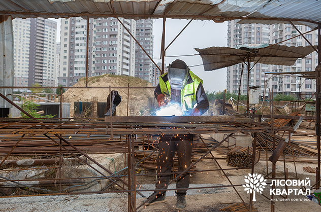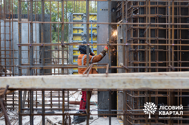 Виконується влаштування вертикальних монолітних конструкцій в секціях 2.2, 2.1, 1. Розпочаті роботи з мурування стін.