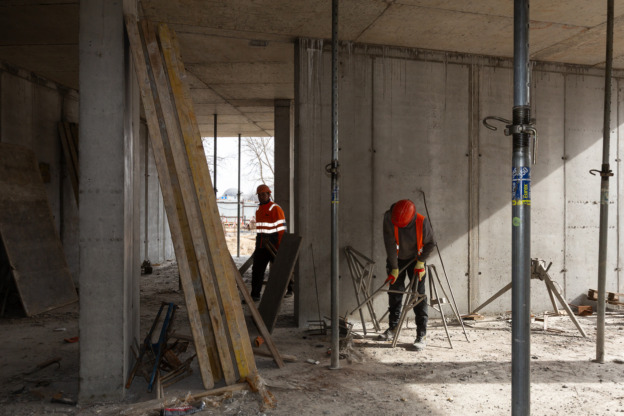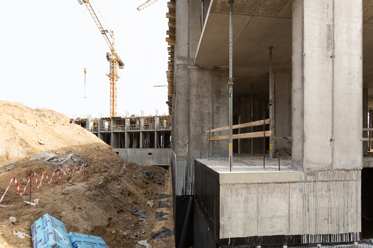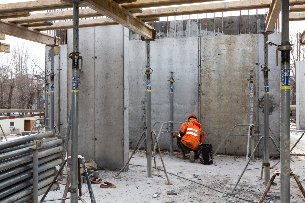 Завершено влаштування вертикальних та горизонтальних монолітних конструкцій каркаса до відмітки 0,000 секції 1, виконуються роботи з улаштування 2-го поверху.