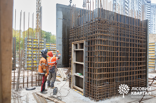 Виконується влаштування вертикальних монолітних конструкцій в секціях 2.2, 2.1, 1. Розпочаті роботи з мурування стін.