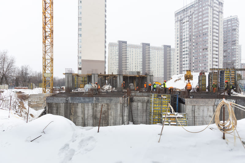 Завершено влаштування вертикальних та горизонтальних монолітних конструкцій каркаса до відмітки 0,000 секції 1, виконуються роботи з улаштування 1-го поверху (готовність — 85%).