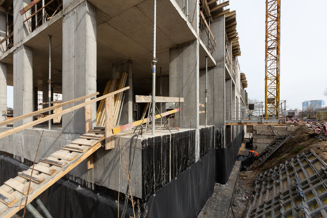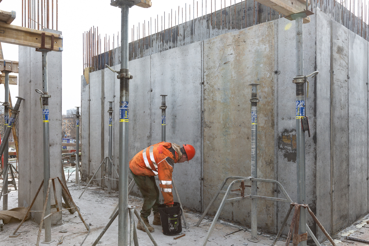 Завершено влаштування вертикальних та горизонтальних монолітних конструкцій каркаса до відмітки 0,000 секції 1, виконуються роботи з улаштування 2-го поверху.